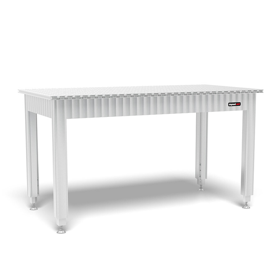 The versatile workbench has a height-adjustable frame made of aluminum profiles, which enables a flexible working height of 800 to 975 mm. The robust table surface made of aluminum profiles is equipped with precise boreholes and hexagon slots that provide numerous clamping and mounting options.
