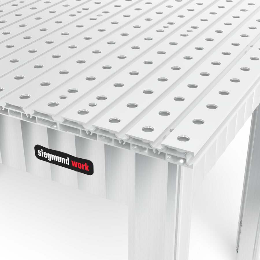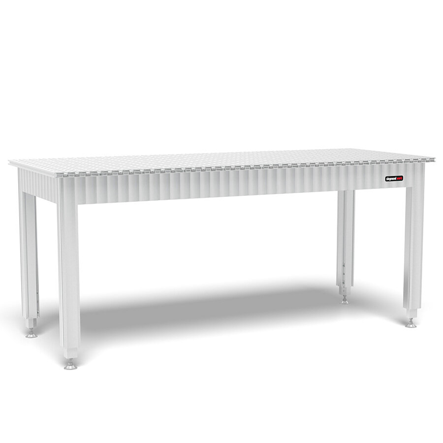 - Tischoberfläche: Aluminiumprofile mit Bohrungen Ø 16 mm, Abstand 50 mm.